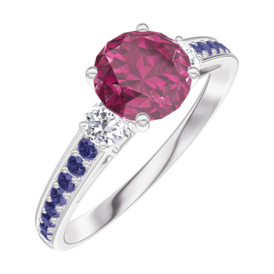 « L'ATELIER » Nº165436Ring Weißgold 375/-(9Kt) - Rubin rund 0.7 Karat - Seitliche Steine Diamant - Fassung Blauer Saphir 5