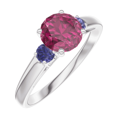 « L'ATELIER » Nº165464Ring Weißgold 375/-(9Kt) - Rubin rund 0.7 Karat - Seitliche Steine Blauer Saphir 4.9