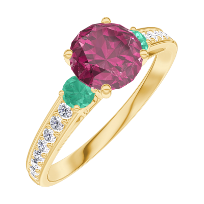 « L'ATELIER » NR. 165486Ring Gelbgold 375/-(9Kt) - Rubin rund 0.7 Karat - Seitliche Steine Smaragd - Fassung Diamant 4.9