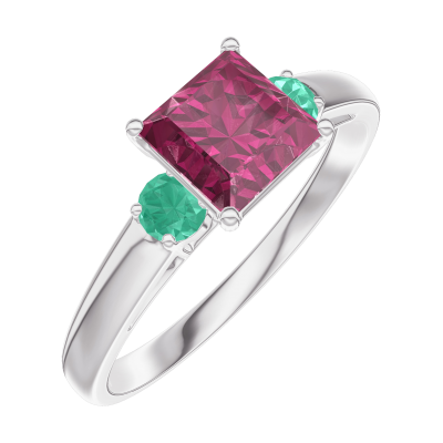 « L'ATELIER » Nº165584Ring Weißgold 375/-(9Kt) - Rubin Prinzess 0.7 Karat - Seitliche Steine Smaragd