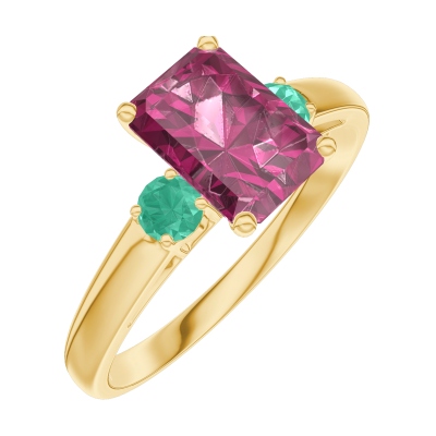 « L'ATELIER » Nº165682Ring Gelbgold 375/-(9Kt) - Rubin Rechteckig 0.7 Karat - Seitliche Steine Smaragd