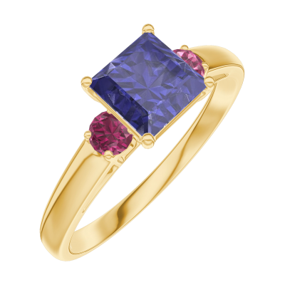 « L'ATELIER » Nº166141Ring Gelbgold 750/-(18Kt) - Blauer Saphir Prinzess 0.7 Karat - Seitliche Steine Rubin