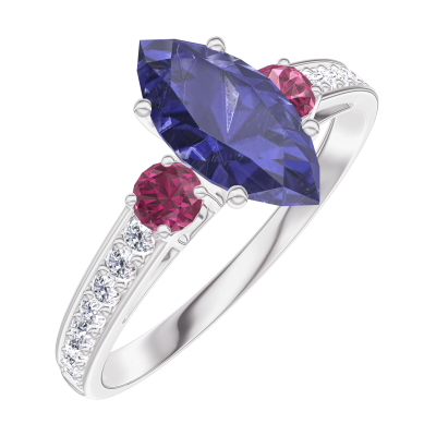 « L'ATELIER » NR. 166548Ring Weißgold 375/-(9Kt) - Blauer Saphir Marquise 0.7 Karat - Seitliche Steine Rubin - Fassung Diamant