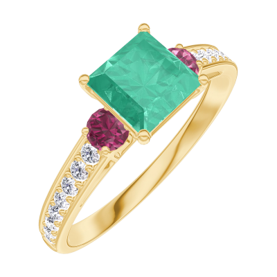 « L'ATELIER » Nº166745Ring Gelbgold 750/-(18Kt) - Smaragd Prinzess 0.7 Karat - Seitliche Steine Rubin - Fassung Diamant