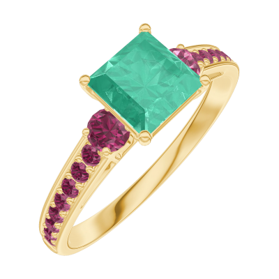 « L'ATELIER » Nº166749Ring Gelbgold 750/-(18Kt) - Smaragd Prinzess 0.7 Karat - Seitliche Steine Rubin - Fassung Rubin