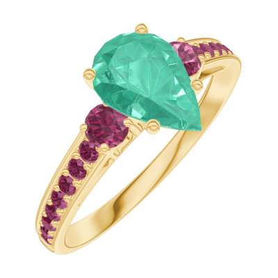 « L'ATELIER » Nº167049Ring Gelbgold 750/-(18Kt) - Smaragd Tropfen 0.7 Karat - Seitliche Steine Rubin - Fassung Rubin