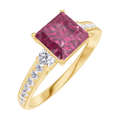 « L'ATELIER » NR. 167925Ring Gelbgold 750/-(18Kt) - Rubin Prinzess 1 Karat - Seitliche Steine Diamant - Fassung Diamant
