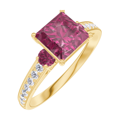 « L'ATELIER » NR. 167945Ring Gelbgold 750/-(18Kt) - Rubin Prinzess 1 Karat - Seitliche Steine Rubin - Fassung Diamant