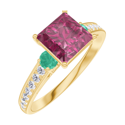 « L'ATELIER » Nº167986Ring Gelbgold 375/-(9Kt) - Rubin Prinzess 1 Karat - Seitliche Steine Smaragd - Fassung Diamant
