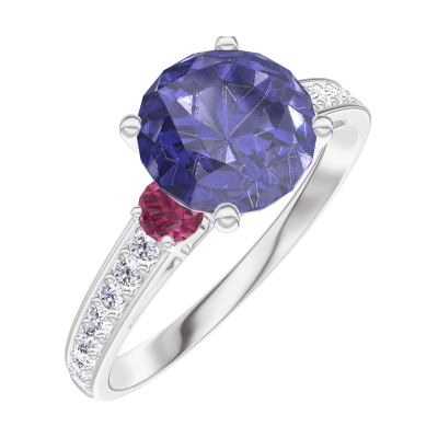 « L'ATELIER » NR. 168448Ring Weißgold 375/-(9Kt) - Blauer Saphir rund 1 Karat - Seitliche Steine Rubin - Fassung Diamant 4.8