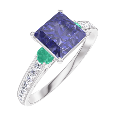 « L'ATELIER » Nº168587Ring Weißgold 750/-(18Kt) - Blauer Saphir Prinzess 1 Karat - Seitliche Steine Smaragd - Fassung Diamant