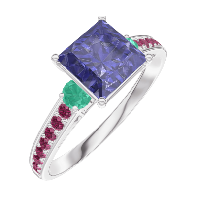 « L'ATELIER » NR. 168591Ring Weißgold 750/-(18Kt) - Blauer Saphir Prinzess 1 Karat - Seitliche Steine Smaragd - Fassung Rubin
