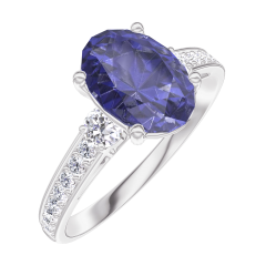 Ring Weißgold 750/-(18Kt) - Blauer Saphir Oval 1 Karat - Seitliche Steine Diamant - Fassung Diamant