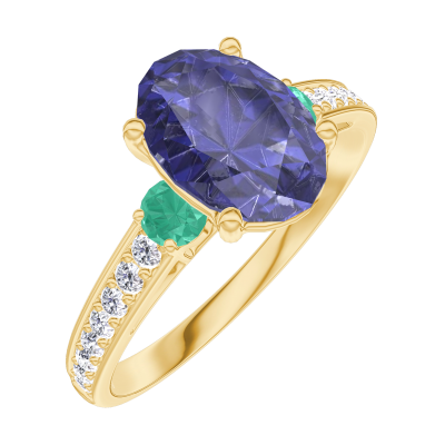 « L'ATELIER » NR. 168785Ring Gelbgold 750/-(18Kt) - Blauer Saphir Oval 1 Karat - Seitliche Steine Smaragd - Fassung Diamant 4.7