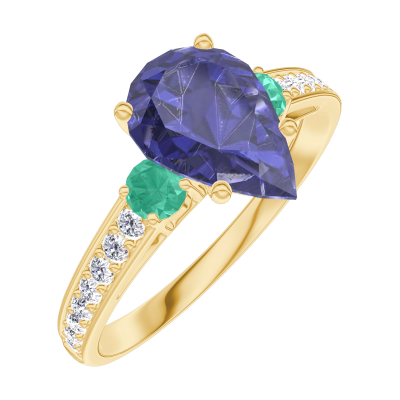 « L'ATELIER » NR. 168886Ring Gelbgold 375/-(9Kt) - Blauer Saphir Tropfen 1 Karat - Seitliche Steine Smaragd - Fassung Diamant