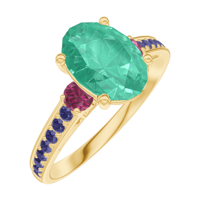 « L'ATELIER » Nº169353Ring Gelbgold 750/-(18Kt) - Smaragd Oval 1 Karat - Seitliche Steine Rubin - Fassung Blauer Saphir 4.7