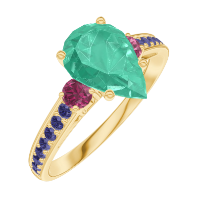 « L'ATELIER » Nº169453Ring Gelbgold 750/-(18Kt) - Smaragd Tropfen 1 Karat - Seitliche Steine Rubin - Fassung Blauer Saphir