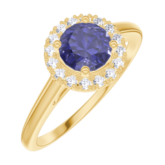 Ring Gelbgold 375/-(9Kt) - Blauer Saphir rund 0.5 Karat - Halo Diamant