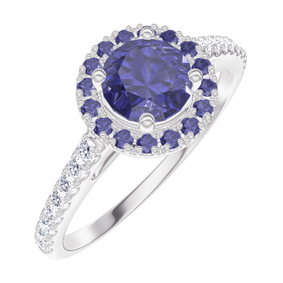 « L'ATELIER » NR. 170615Ring Weißgold 750/-(18Kt) - Blauer Saphir rund 0.5 Karat - Halo Blauer Saphir - Fassung Diamant 4.7
