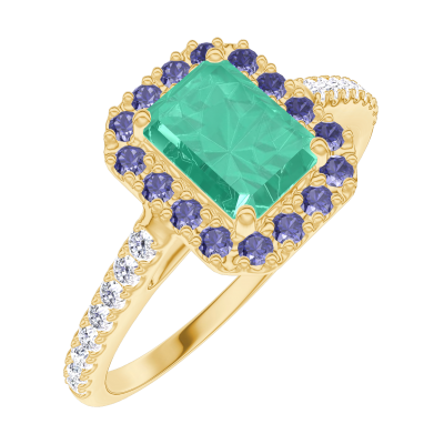 « L'ATELIER » NR. 170997Ring Gelbgold 750/-(18Kt) - Smaragd Rechteckig 0.5 Karat - Halo Blauer Saphir - Fassung Diamant 4.7