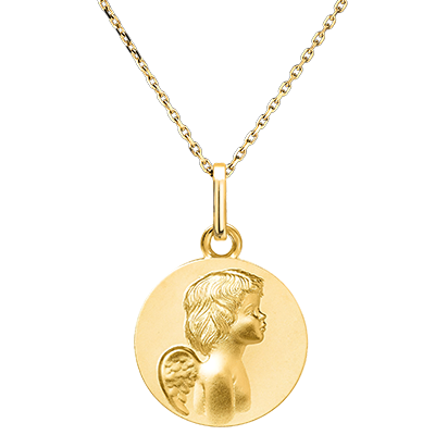 Dieses zarte Engelsprofil mit sanften Zügen symbolisiert Gelassenheit, wohlwollende Präsenz und himmlischen Schutz. Material: 9-karätiges Gelbgold (375/1000). Durchmesser: 16 mm. Finish: Sandgestrahltes Goldrelief. Personalisierbare Gravur auf der Rückseite. Ohne Kette. Gelbgold (375/-): 1.5 g. Weitere Abmessungen