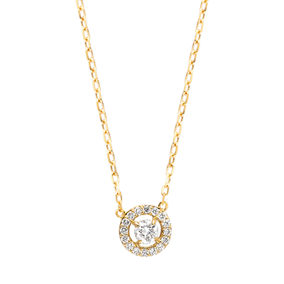 Ein zentraler, rund geschliffener Diamant von 0,2 Karat strahlt im Mittelpunkt eines funkelnden Halos aus sechzehn zarten Diamanten.Ein sonniger, raffinierter Glanz, der Sie jeden Tag als Lichtquelle begleitet.