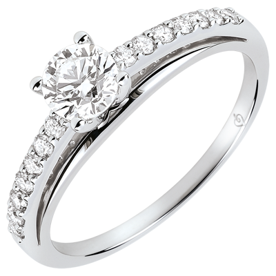 Ein Diamant Solitaire begleitet von Diamanten mit Brillantschliff, der für höchsten Glanz auf einer Weißgold-Fassung sorgt. 15 Diamanten : 0.6 Karat - Weißgold (750/-): 2.7 g. Weitere Abmessungen
