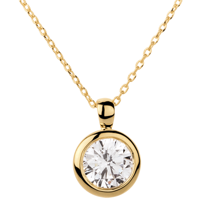 Ein dezent funkelnder Solitärdiamant im Schutze einer feinen Fassung aus Gelbgold. Mit Kette 42 cm + Verlängerung von 3 cm; 750/-. 1 Diamant : 2 Karat - Gelbgold (750/-): 5.3 g. Weitere Abmessungen
