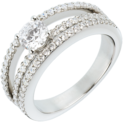 Dieser traumhafte Ring präsentiert sich als Dreiergespann, welches von Diamanten gesäumt, den zentralen Solitär perfekt in Szene setzt. 67 Diamanten : 1.03 Karat - Weißgold (750/-): 6.6 g. Weitere Abmessungen
