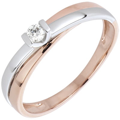 Ein Solitärdiamant thront auf einer modernen Fassung in Form eines Doppelringes in Rosé- und Weißgold. 1 Diamant : 0.07 Karat - Weiß-und Rotgold (750/-): 2.4 g. Weitere Abmessungen
