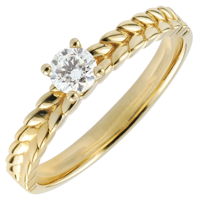 Ein Solitärdiamant, sorgfältig von vier Krappen gefasst, posiert auf einem Ring, der an zart geflochtes Blattwerk erinnert - Ein origineller und raffinierter Verlobungsring. 1 Diamant : 0.2 Karat - Gelbgold (750/-): 2.8 g. Weitere Abmessungen