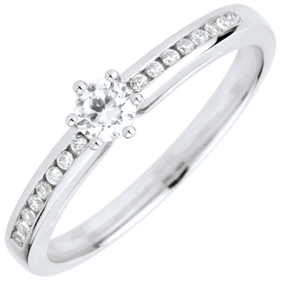 Ein Solitär in 6er Krappenfassung ruht auf einer Fassung besetzt mit Diamanten. 17 Diamanten : 0.25 Karat - Weißgold (375/-): 1.9 g. Weitere Abmessungen