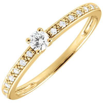 Dieser elegante und klassische Verlobungsring ist mit einem Diamanten in 4er Krappenfassung besetzt, welcher von funkelnden Brillanten umrandet ist. 15 Diamanten : 0.16 Karat - Gelbgold (375/-): 1.1 g. Weitere Abmessungen