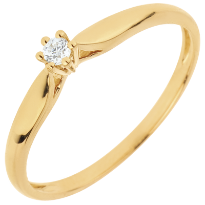 Ein Ring zart wie Schilfgras, gekrönt von einem Diamant in einer 6er Krappenfassung. 1 Diamant : 0.05 Karat - Gelbgold (750/-): 1.1 g. Weitere Abmessungen