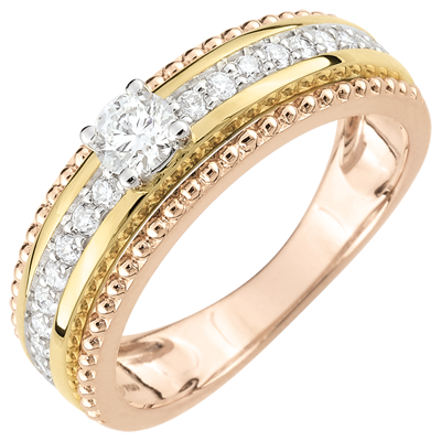 Ein erlesener Solitärdiamant wird von zwei Reihen Goldperlen getragen, die in ihrer Mitte einen Diamantring bergen. Dieser Ring in dreierlei Gold trägt seine Weiblichkeit auf glänzende Art und Weise zur Schau. 19 Diamanten : 0.38 Karat - Tricolor (375/-): 3.5 g. Weitere Abmessungen