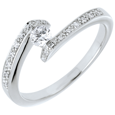 Ein fließdendes Band aus Weißgold verziert mit Diamanten bringt den Solitär aus 0.15 Karat voll zur Geltung.