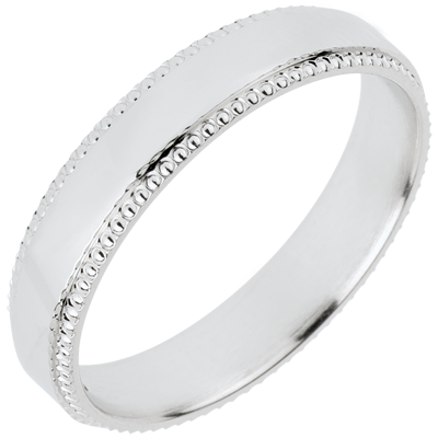Ein Trauring aus Weißgold mit einer Prägung für ein hohes Maß an Brillanz.
