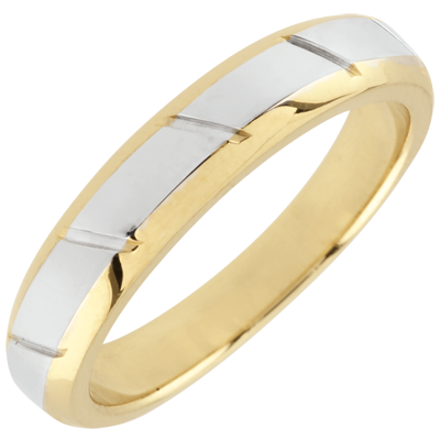 Ein Trauring aus Gelbgold an den Seiten abgeschrägt, versehen mit einem geriffelten Band aus Weißgold