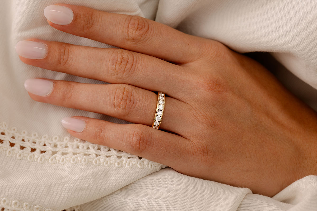 Eine gelbgoldene Kanalfassung hält 23 funkelnde Diamanten im Brillant-Schliff, ein edler Memoire Trauring.