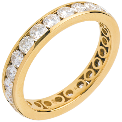 Eine gelbgoldene Kanalfassung hält 23 funkelnde Diamanten im Brillant-Schliff, ein edler Memoire Trauring. 23 Diamanten : 2 Karat - Gelbgold (750/-): 4.7 g. Weitere Abmessungen