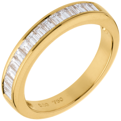Eine gelbgoldene Kanalfassung hält eine Reihe funkelnder Diamanten im Coussin-Schliff, ein edler Trauring.