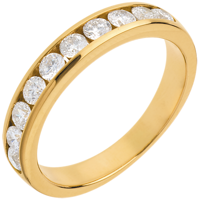 Eine gelbgoldene Kanalfassung hält 10 funkelnde Diamanten im Brillant-Schliff, ein edler Memoire Trauring.