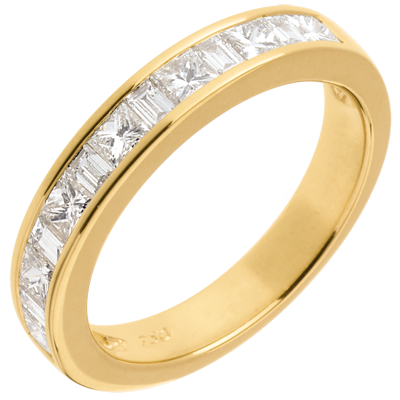 Eine gelbgoldene Kanalfassung hält 8 funkelnde Diamanten im Coussin-Schliff, ein edler Trauring. 13 Diamanten : 0.7 Karat - Gelbgold (750/-): 4.2 g. Weitere Abmessungen