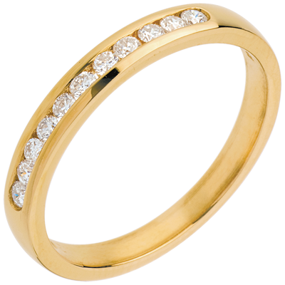 Eine gelbgoldene Kanalfassung hält 11 funkelnde Diamanten im Brillant-Schliff, ein edler Trauring.