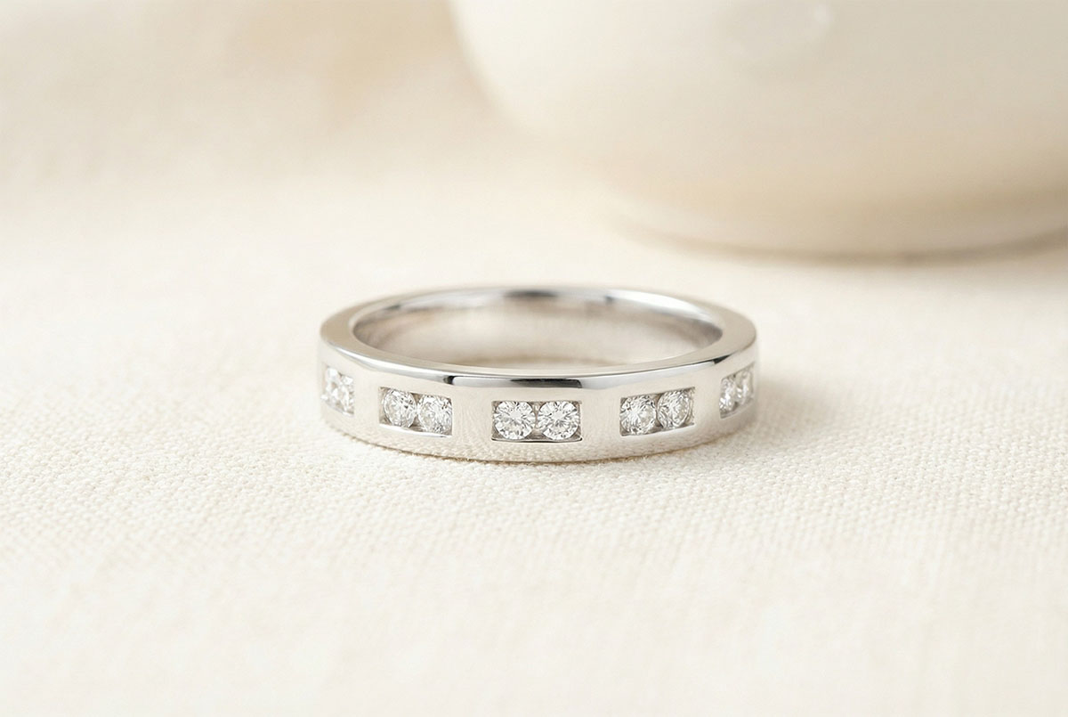 Trauring zur Hälfte mit Diamanten besetzt in Weissgold - Kanalfassung - 0.22 Karat - 10 Diamanten
