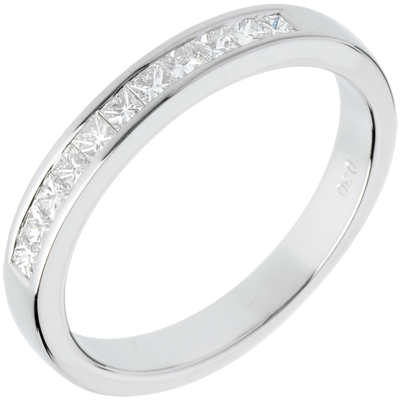 Eine weissgoldene Kanalfassung hält 11 funkelnde Diamanten im Coussin-Schliff, ein edler Trauring.