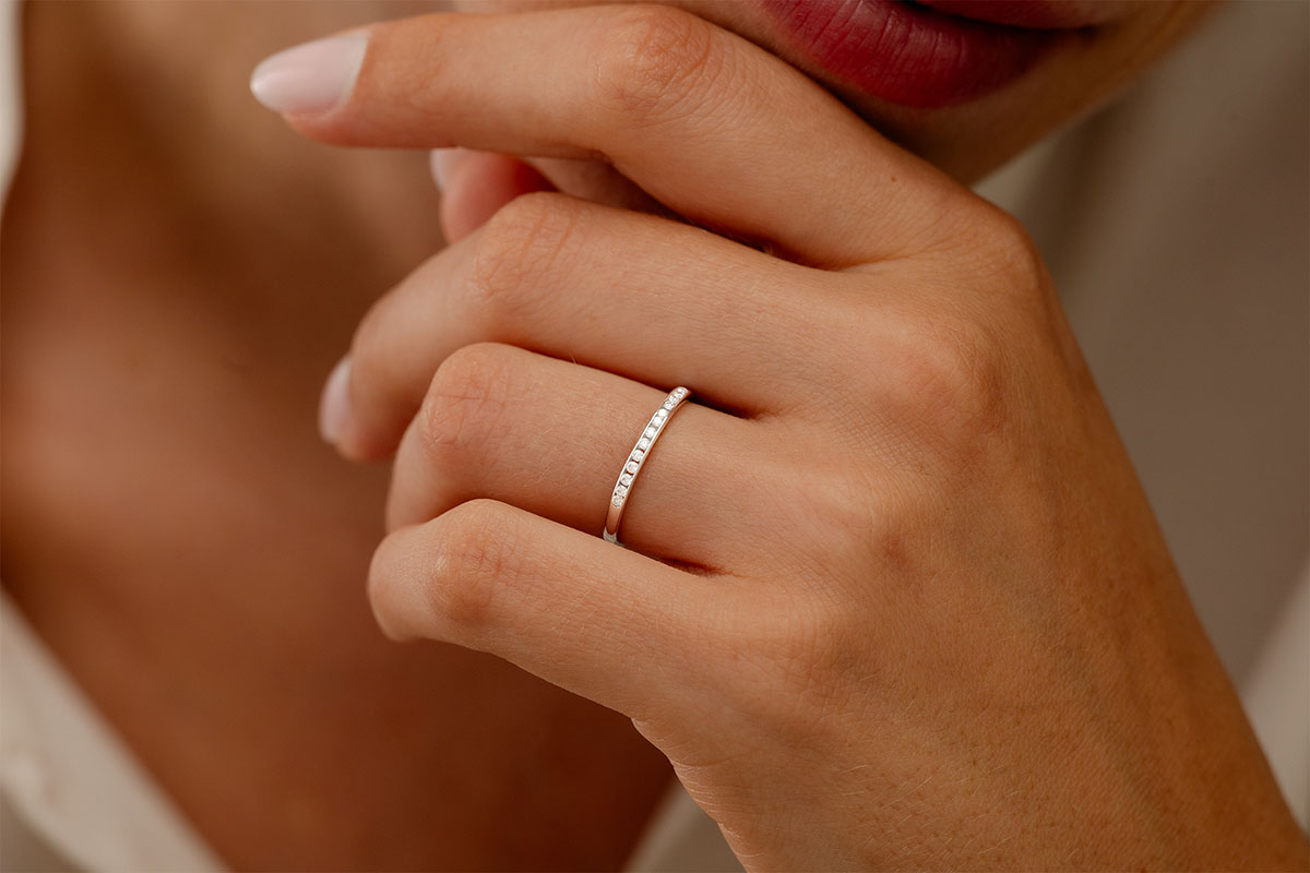 Eine weissgoldene Kanalfassung hält 11 funkelnde Diamanten im Brillant-Schliff, ein edler Memoire Trauring.