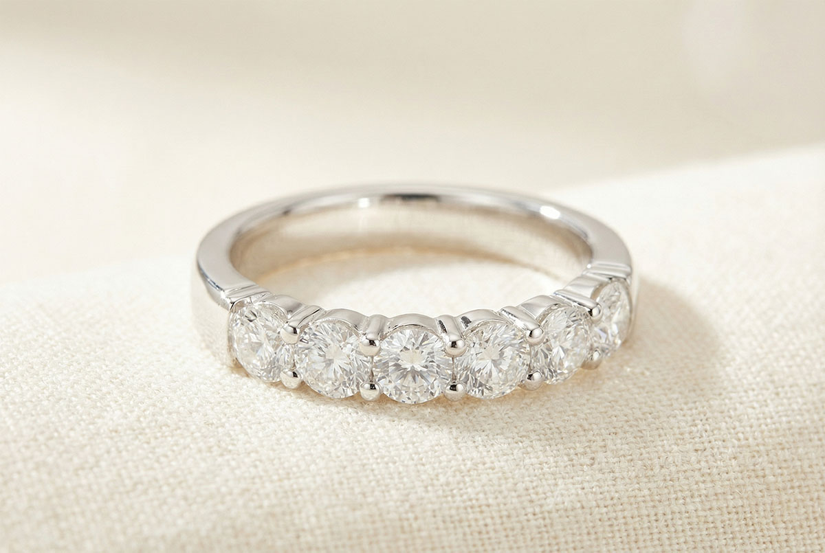 Eine weissgoldene Krappenfassung hält 7 funkelnde Diamanten, ein edler Trauring.