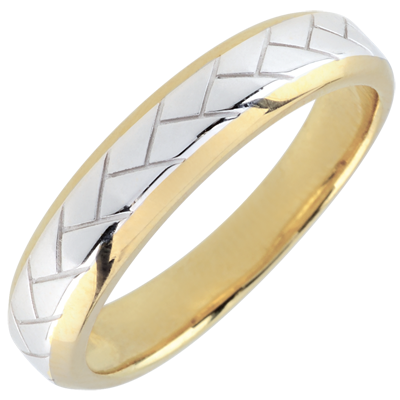 Ein Trauring aus Gelbgold an den Seiten abgeschrägt mit einem Webemuster aus Weißgold in der Mitte.