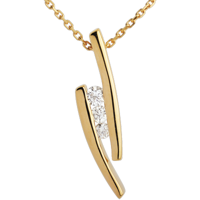 Eine edle Diamantentrilogie ist eingefasst von zwei schlichten Gelbgoldstäbchen. Ein originelles Collier.